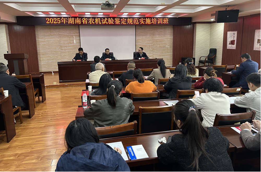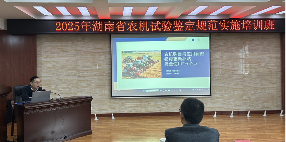 11月3日至11月4日,湖南省农机事务中心在长沙举办了2025年湖南省农业机械试验鉴定规范实施培训班。培训班邀请了省农业农村厅农机化管理处相关领导、省内农机试验鉴定领域相关专家进行授课,来自湖南、山东、云南等省的60余家农机生产企业派员参加了培训。