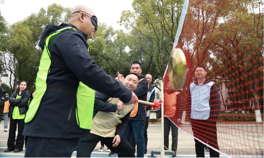 本届运动会共有4支队伍参赛,采用团体积分赛制,精心设置“腰缠万贯”“蒙眼鸣锣”“快乐排球”和“团体拔河”等四个特色项目。“腰缠万贯”环节,队员们将红丝带缠于腰间,全力奔跑、默契接力;“蒙眼鸣锣”环节,参赛队员探步寻锣,赛场欢声笑语不断;“快乐排球”项目选用超大号排球作为道具,对阵双方斗智斗勇、攻防兼备,精彩场面接连不断;压轴登场的拔河比赛,更是将全场气氛推向高潮,队员们全神贯注、攥紧绳索,齐心协力向着同一目标发力。赛场上,欢呼雀跃声与鼓劲呐喊声此起彼伏,热闹非凡。
