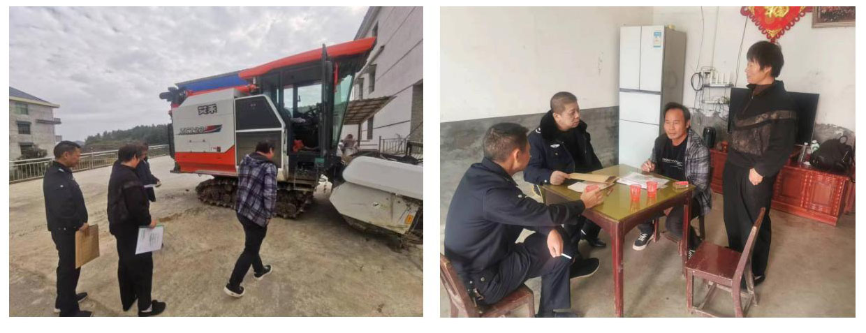 在现场,核对购机发票、合格证等资料后,工作人员俯身钻入收割机底部,举着强光手电,在密密麻麻的管线中寻找发动机的编号,又用抹布用力地擦拭着底盘机架上的泥巴,努力寻找机架编号。保持单膝跪地的姿势十多分钟里,衣袖被汗水和泥水浸湿。“每个编号就像农机的身份证,必须确保百分百准确。”他一边录入数据一边解释。